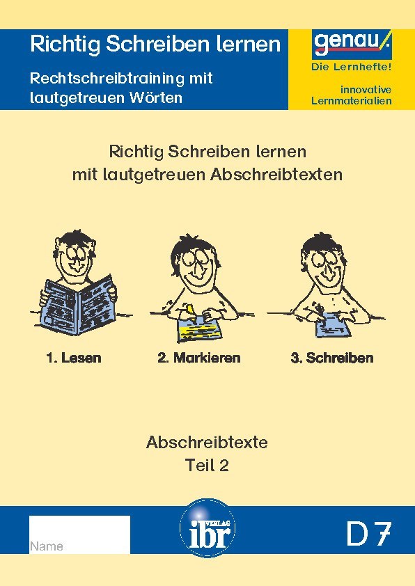 Die Abschreibtexte der genau-Lernhefte D6 und D7 bestehen ausschließlich aus lautgetreuen Wörtern. Mit den differenzierten genau-Lernheften D6 und D7 wird die Laut-Buchstaben-Zuordnung intensiv trainiert.