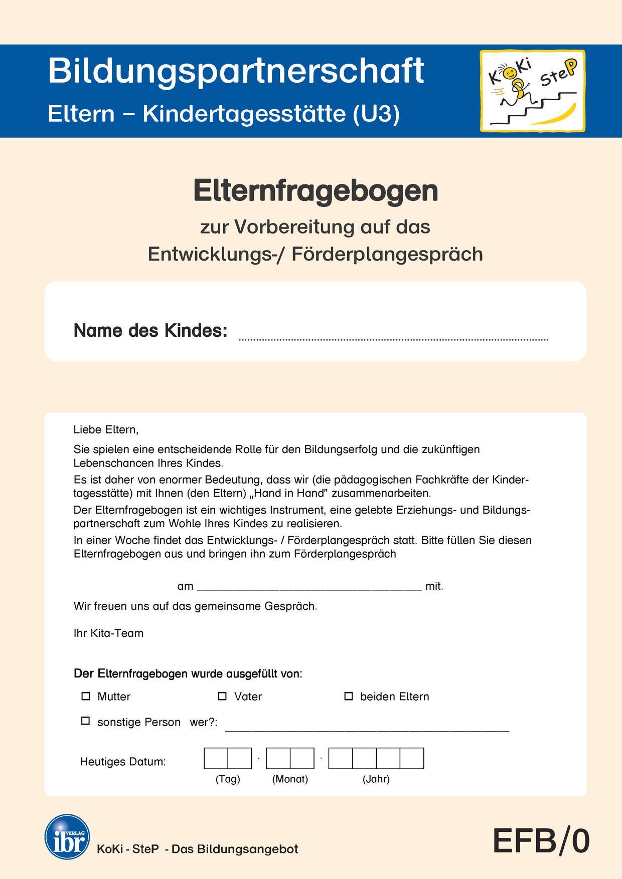 Der Elternfragebogen ist an den Förderplan „Übergang Krippe-Kita“ (FP-U3) angepasst, so dass die wesentlichen Gesprächsinhalte allen Gesprächsbeteiligten transparent sind.