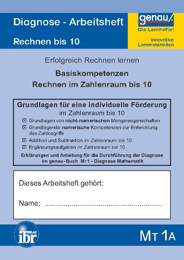 Die notwendigen Basiskompetenzen, sowie die beiden Grundrechenarten Addition und Subtraktion im Zahlenraum bis 10 werden in dem Diagnose-Arbeitsheft MT1A getestet.
